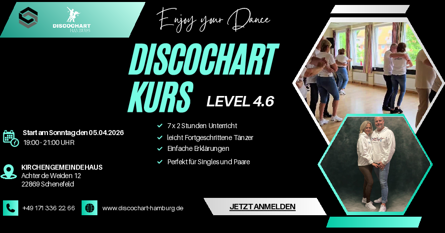 Auf meiner Website erwarten Sie inspirierende Kurse, die Anfänger willkommen heißen und Fortgeschrittene herausfordern. Lassen Sie sich von DiscoChart mit seiner erotischen Eleganz verzaubern und von DiscoFox mit seiner dynamischen Vielseitigkeit mitreißen. Hier verbessern Sie nicht nur Ihre Tanztechnik, sondern finden auch eine Gemeinschaft, die Ihre Leidenschaft teilt.